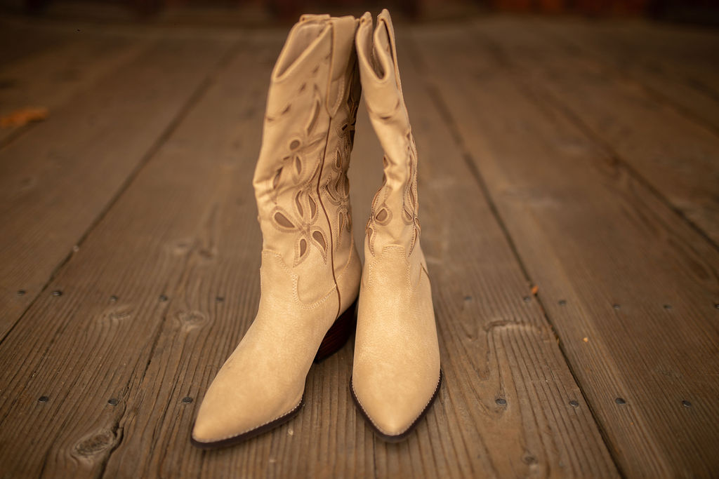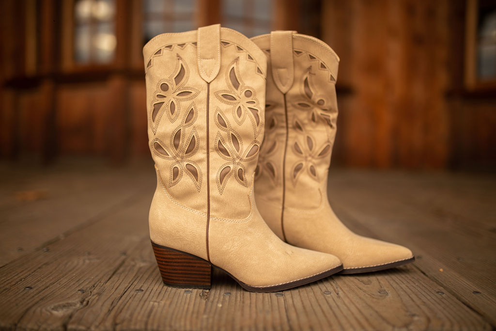 Designed to elevate any outfit, these pull-on cowboy boots feature intricate floral cutout designs that bring a feminine touch to classic western style. Their soft khaki tone creates a versatile neutral look that pairs effortlessly with dresses, denim, skirts, and all your seasonal favorites.
